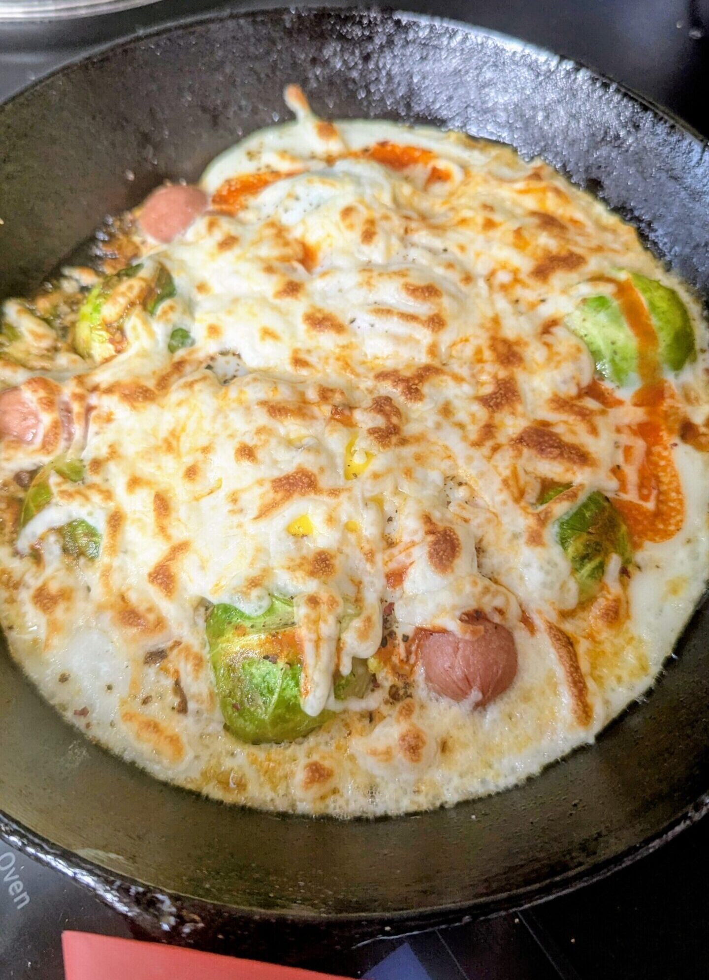 Une recette rapide et facile contenant des œufs, des saucisses et du choux de Bruxelles